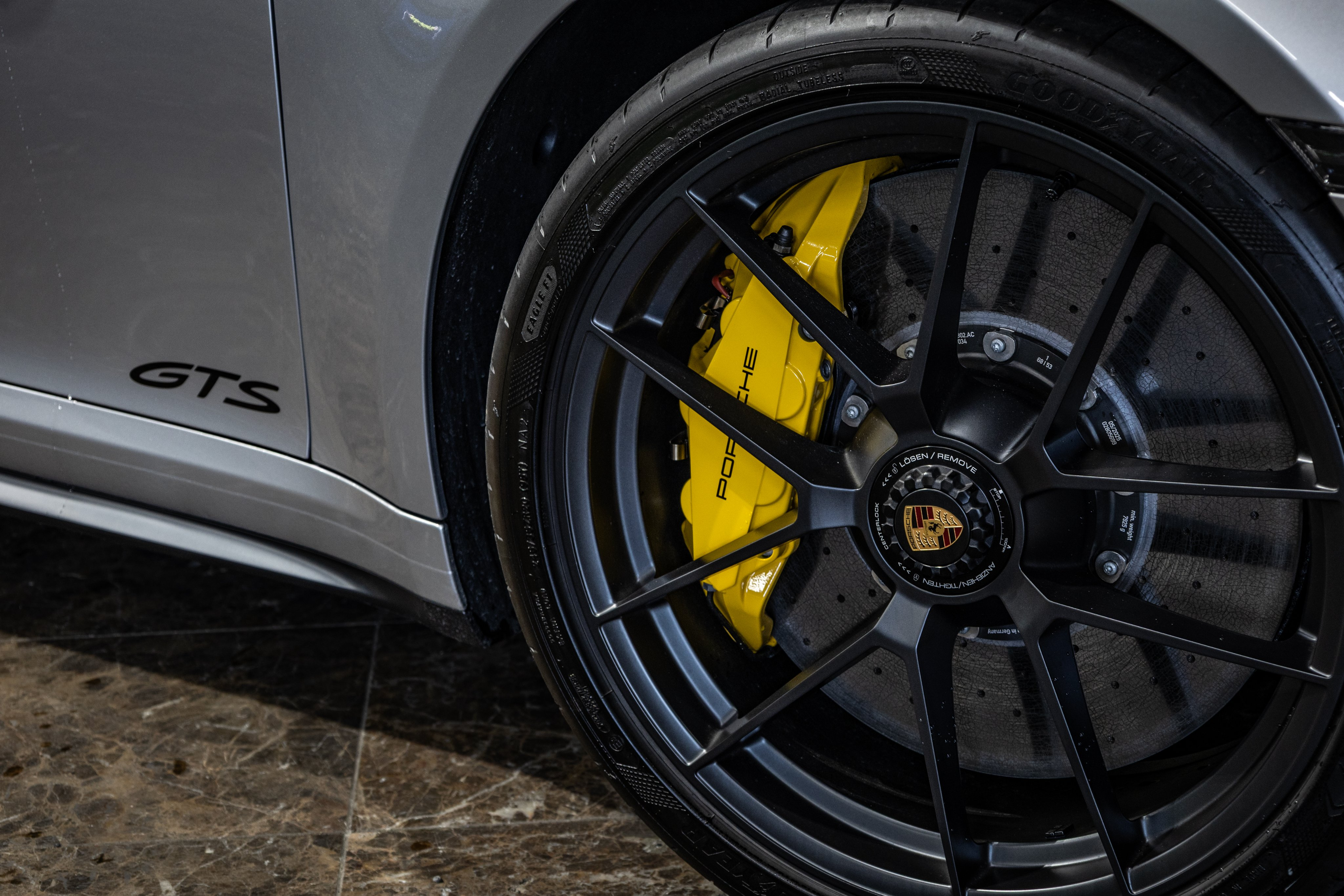 巨大なイエローのキャリパーは992.1の「ターボS」用のブレーキを使っているそうで、フロントはなんと10ピストン!