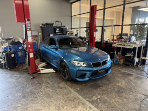 ショールーム内には車両展示の他、オイル交換などの軽整備にも対応する2柱リフトを備えています。